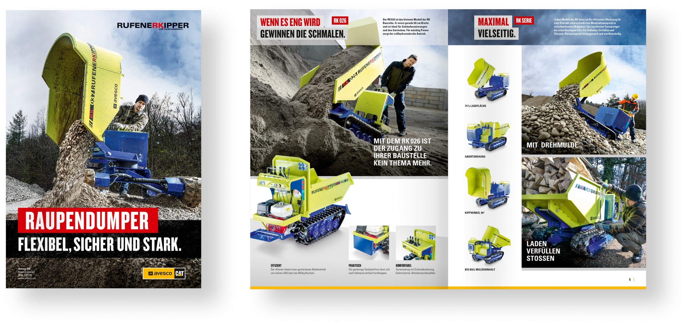 Avesco CAT steigt mit den hervorragenden Rufener-Kipper ins hart umkämpfte Kleinbaggergeschäft ein. Rufener wird zu 100% in der Schweiz entwickelt und gefertigt. Nur durch unschlagbare, innovative Technik und höchste Qualität haben sie im Markt überhaupt eine Chance. Die Kampagne unterstreicht die einmaligen Vorzüge dieser Geräte.