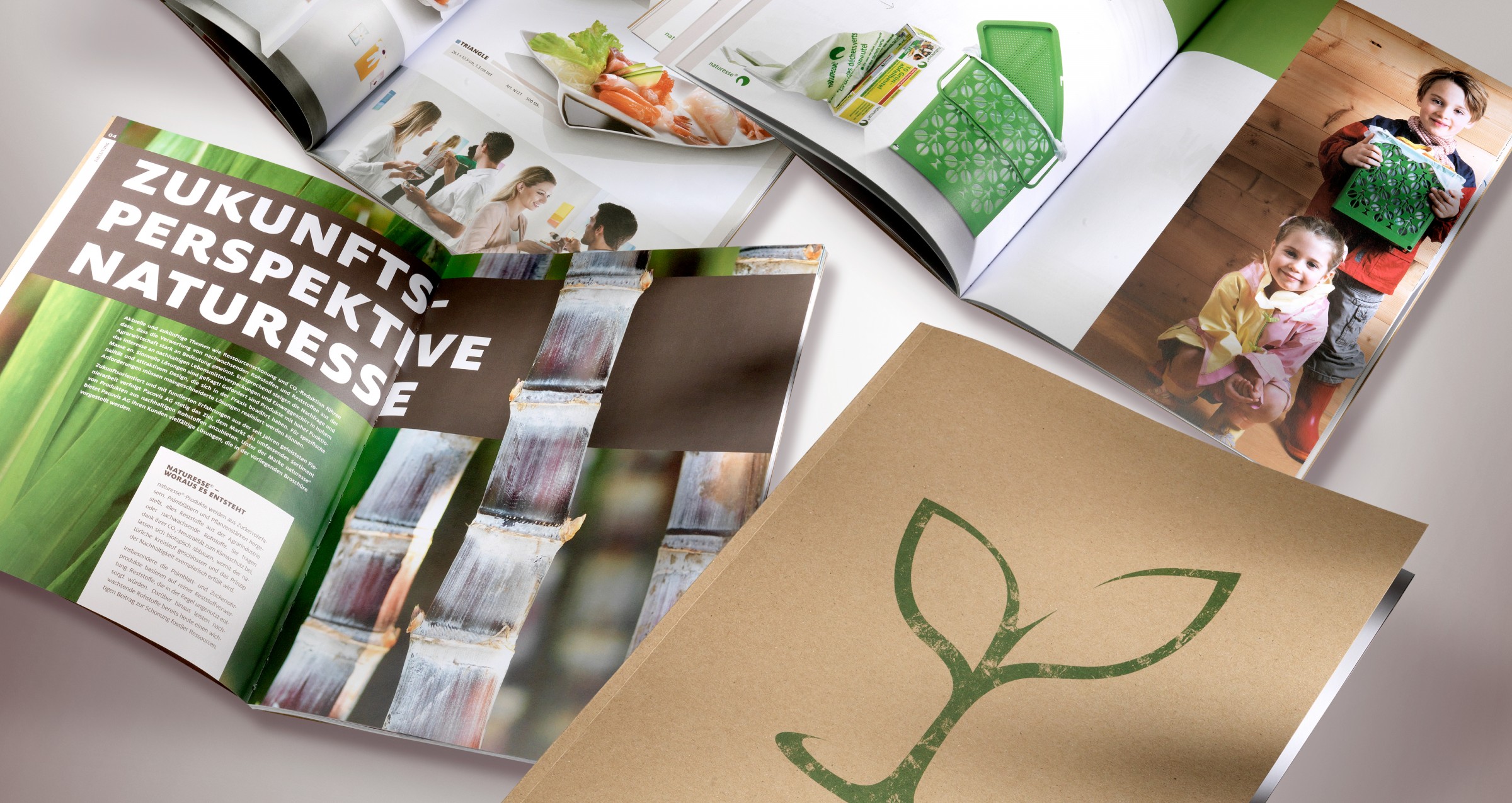 Die vielfältige Naturesse-Artikelwelt stellt die gelebte Zukunft der Ver- brauchsverpackungen und -Geschirrs dar, sind doch alle Produkte aus nachwachsenden Rohstoffen hergestellt. Das fortschrittliche Sortiment richtet sich an naturbewusste Konsumenten, die gleichzeitig Freude an hochwertigen Formen und Materialen bekunden. Mit einem Gestaltungskonzept, das das naturbetonte Umfeld spürbar macht, vereinigt sich das Grafikdesign mit der stimmigen Bildwelt zu einer eigenständigen Gesamtwirkung.