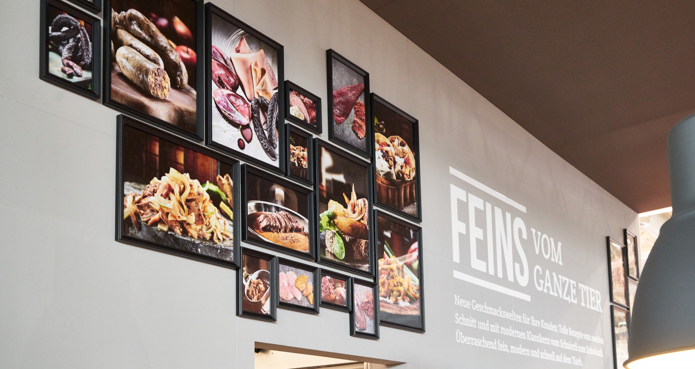 Der Pacovis-Stand. Ein stimmungsvoller Treffpunkt im Zentrum der Metzgerfachmesse die immer parallel zur IGEHO in den gleichen Hallen stattfindet. Die ansprechende Atmosphäre lockte eine Mehrzahl der Messegänger zu Pacovis und viele blieben auch länger. Unsere Aufgabe für die Gestaltung: Das attraktive Standdesign zu ergänzen mit bildlicher Wandgestaltung, die das Motto «Feins vom ganze Tier» eindrücklich erlebbar macht und die Entwicklung von weiteren Details im Sinne des Gesamteindrucks.